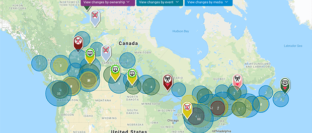Screen capture: Interactive map developed by Local News Research Project that tracks changes in availability of local news across Canada.