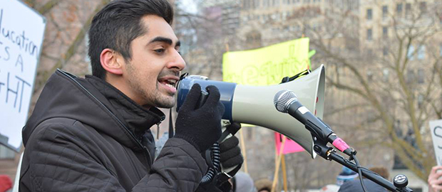 Nasr Ahmed addressed the crowd of students and others at a January protest against post-secondary education funding cuts in Ontario.