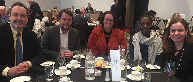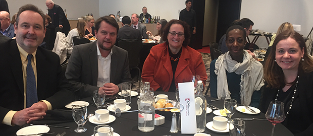 From left: CWA Canada President Martin O'Hanlon joined members Mike Blanchfield (Canadian Press), Nathalie Bastien (CBC), Angie Bonenfant (CBC), and Kristy Kirkup (CP), at a luncheon held by the Canadian Committee for World Press Freedom at the National Arts Centre in Ottawa.