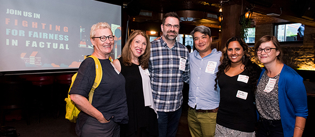 Volunteers with the Fairness in Factual TV campaign gathered with workers at a free social in Toronto in July 2018. From left: Anna Bourque (née Champion), Lise Lareau, James Broadley, Otto Chung, Denise O’Connell, and Katherine Lapointe, CWA Canada’s digital organizer. (Photo: Marta Iwanek)